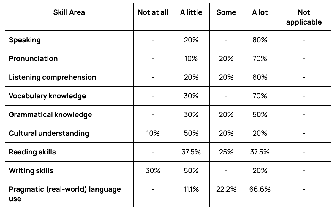 La expresión oral fue el área en la que se percibieron mayores avances, ya que el 80 % de los estudiantes informó haber mejorado «mucho». La pronunciación, el conocimiento del vocabulario, la comprensión auditiva y el uso pragmático del lenguaje también arrojaron resultados muy positivos. La comprensión cultural, la lectura y la escritura registraron avances más modestos, lo que refleja el enfoque principal del programa en la comunicación oral.