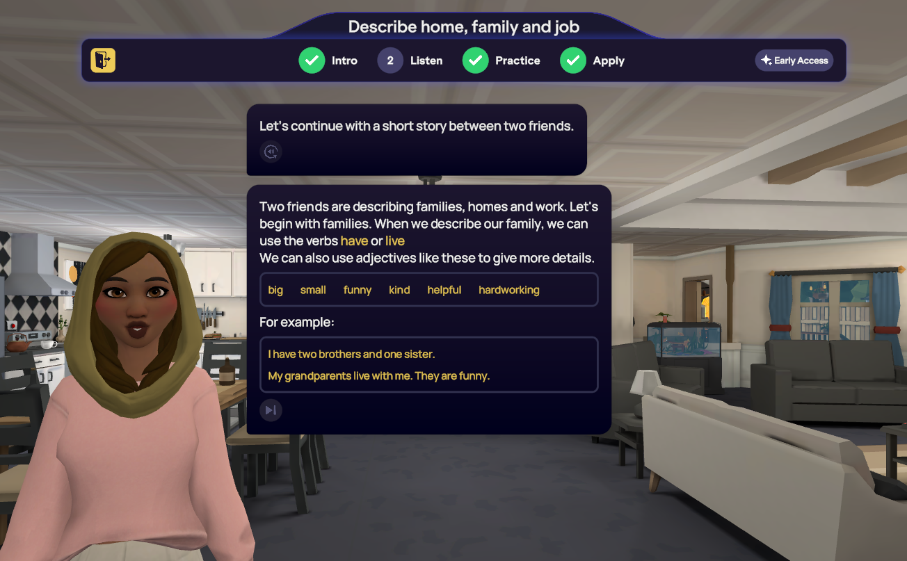 Cada lección ha sido creada por especialistas en planes de estudio y está guiada por IA adaptativa, lo que permite que la práctica y la retroalimentación se ajusten al desempeño del alumno en tiempo real. Las lecciones duran aproximadamente 20 minutos y se desarrollan en entornos 3D contextualizados, como lugares de trabajo, entornos de servicio y situaciones sociales cotidianas.