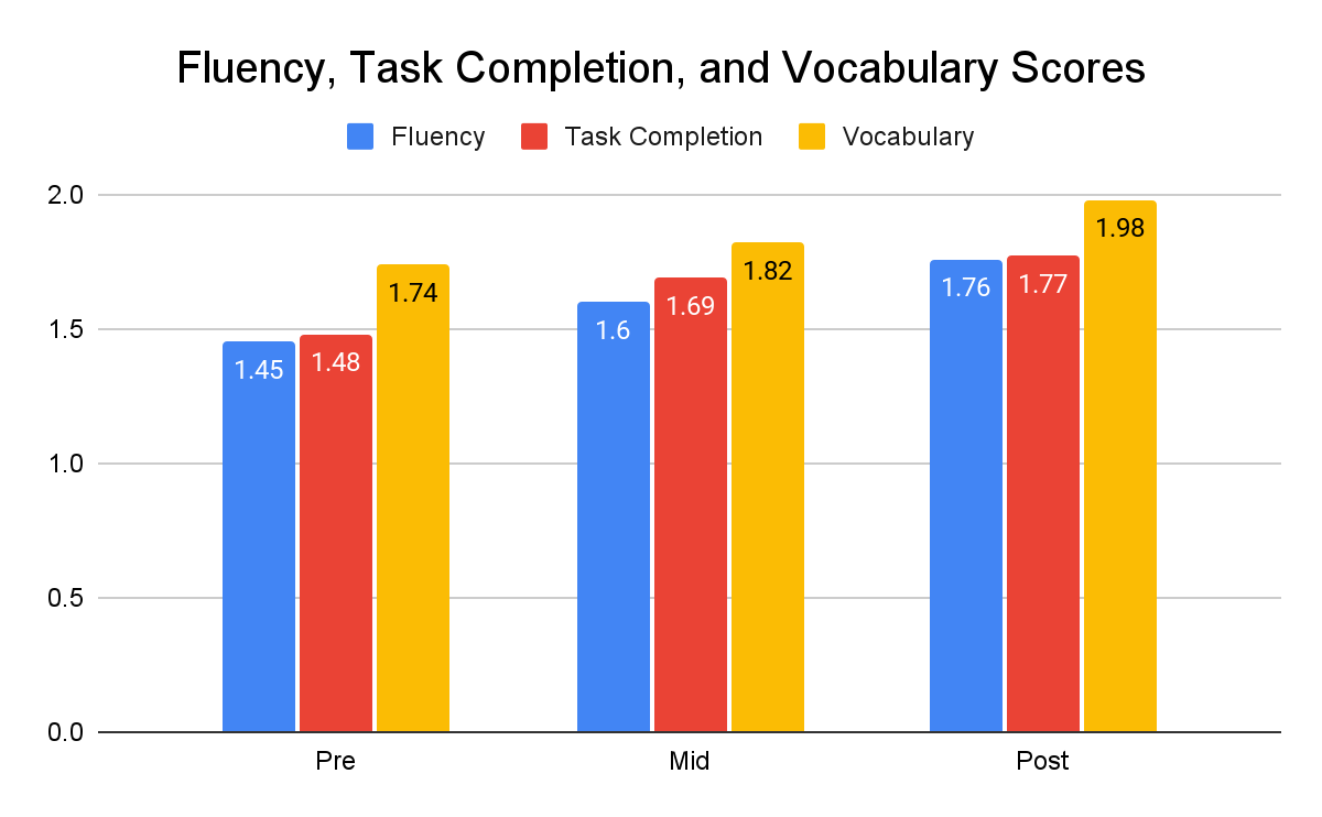 A lo largo del estudio de 16 semanas, los alumnos realizaron tres evaluaciones orales: al inicio (semana 1), a mitad del curso (semana 8) y al final (semana 16). Estas evaluaciones analizaron la gramática, la variedad de vocabulario, la fluidez y la realización de tareas, definida como el logro satisfactorio del objetivo comunicativo.